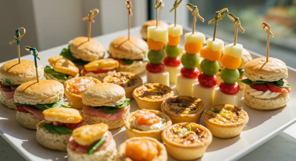 - Mini Sandwiches: Use small bread slices or crackers with fillings like tuna, chicken, or roasted vegetables.
