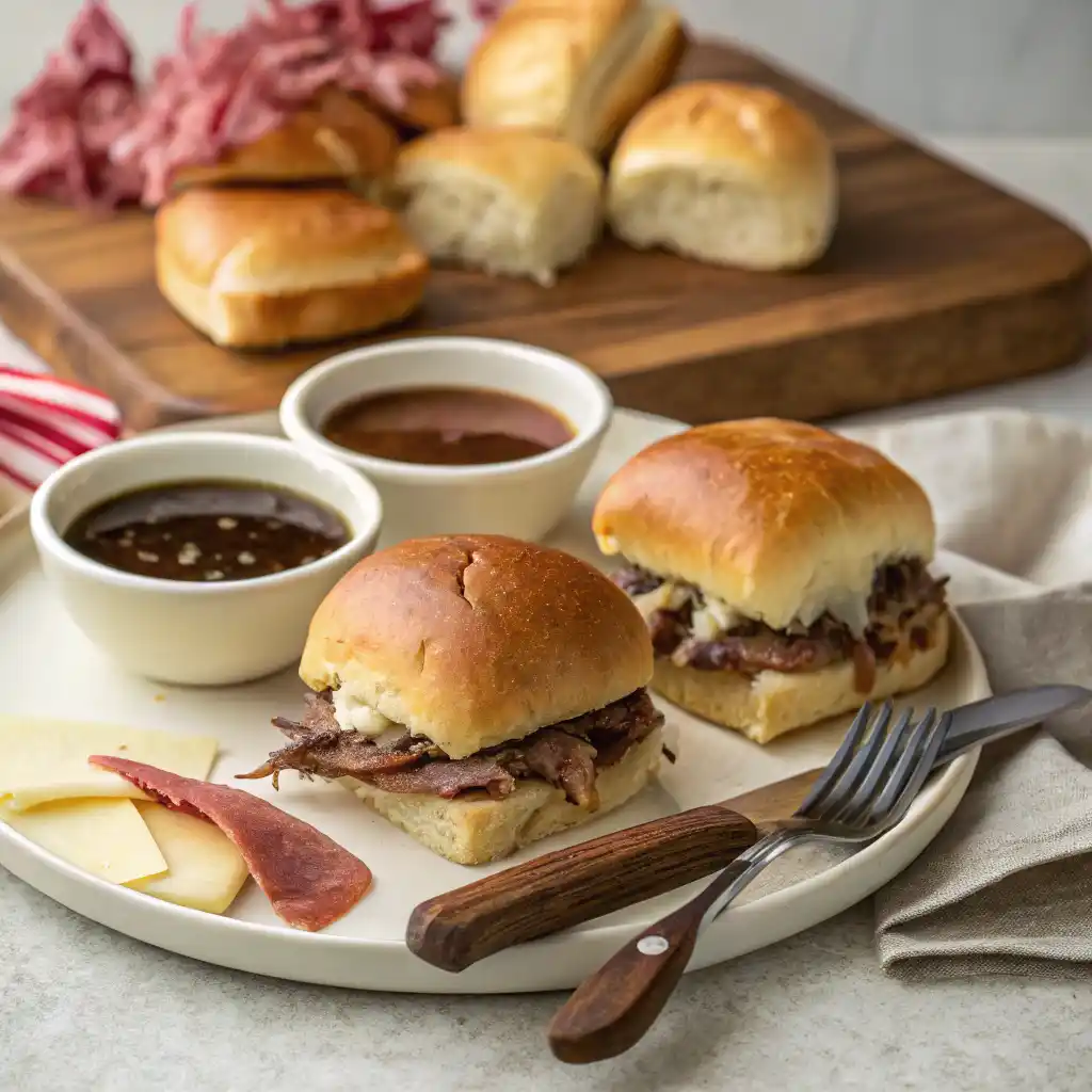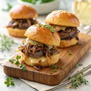 To make your French Dip Sliders even better, try using fresh roast beef from the deli instead of pre-sliced. It adds a nice texture and more flavor. If you’re looking to change up the cheese, Swiss or mozzarella work just as well, depending on your preference. For a little kick, add a layer of horseradish sauce or Dijon mustard inside the buns before adding the beef and cheese. Want to make them extra crispy? Try toasting the buns lightly in the oven before assembling the sliders for a crunchier texture. You can also mix up the au jus by adding a bit of balsamic vinegar or fresh herbs like thyme to give it a unique twist. For a lighter version, swap out the beef for turkey or chicken, and use whole wheat slider buns for a healthier touch. These sliders are super versatile, so feel free to get creative and adjust them to suit your tastes!