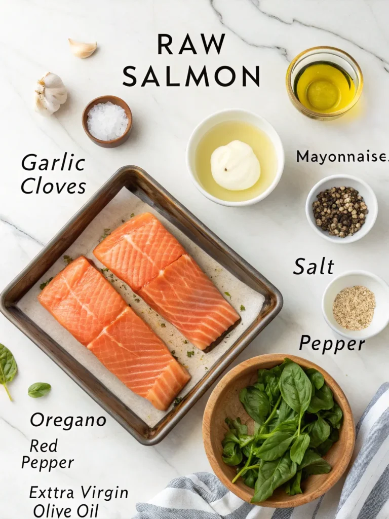 - In a small bowl, mix mayonnaise and minced garlic. Spread the mixture over the salmon.