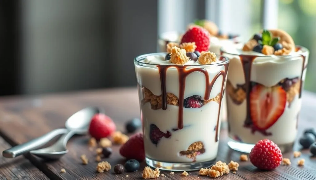 Layered desserts are perfect for quick treats. They’re simple to make and let you pick your favorite flavors. A mix of cream cheese and white chocolate pudding is a hit. It’s great for making many simple dessert recipes, like layered ones.