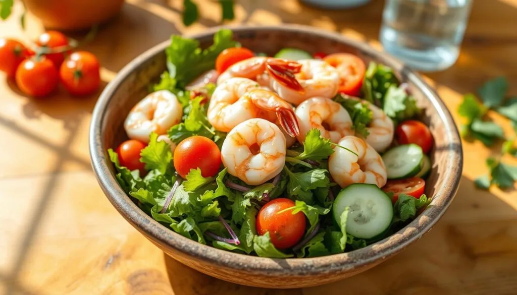 This shrimp salad recipe includes many ingredients full of vitamins and minerals. Shrimp is rich in vitamin B12, selenium, and iodine, making it a great choice for a healthy meal. The salad also has antioxidants like astaxanthin, which fights cell damage and boosts health.