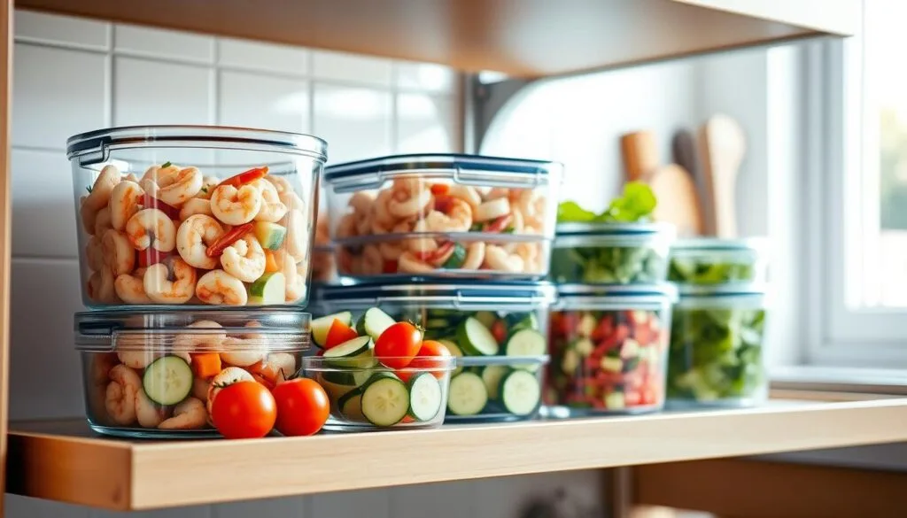 Proper storage is key to keeping your shrimp salad fresh. Store it in an airtight container in the fridge at 40°F (4°C) or below. This way, your salad stays fresh for up to two days.
