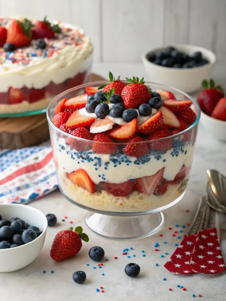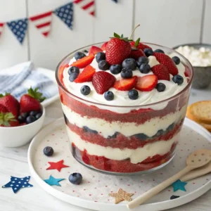 The 4th of July Trifle is more than just a dessert—it’s a celebration in every spoonful. Its vibrant layers of cake, creamy pudding, and fresh berries perfectly capture the spirit of summer and patriotism. Whether you’re hosting a big family barbecue or a small gathering with friends, this trifle is guaranteed to impress your guests and bring smiles all around.