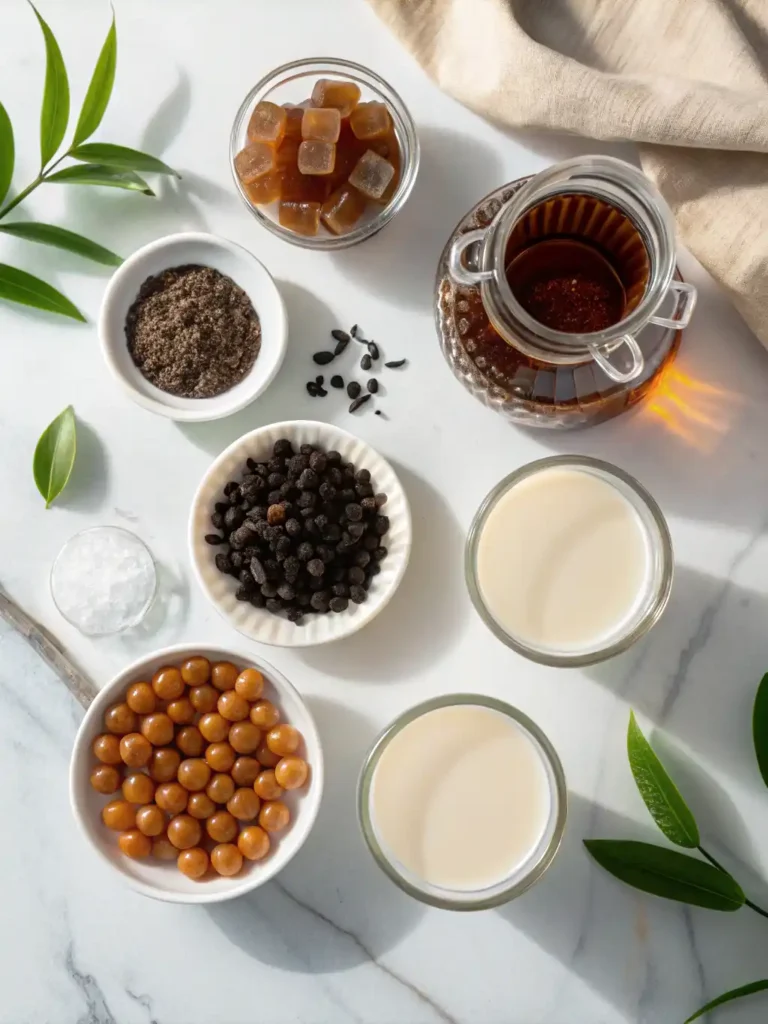 These ingredients make two tall servings of homemade brown sugar bubble tea with chewy pearls and rich flavor.