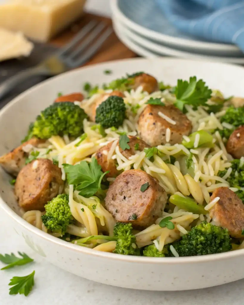 Serve Chicken Sausage and Broccoli Orzo hot in a bowl. You can add extra Parmesan cheese on top for more flavor. This dish goes well with a side salad or some crusty bread for a complete meal.
