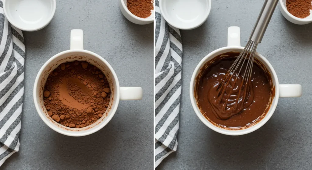 - Mix the dry ingredients – In your mug, combine the flour, cocoa powder, and sugar. Stir well to remove any lumps.