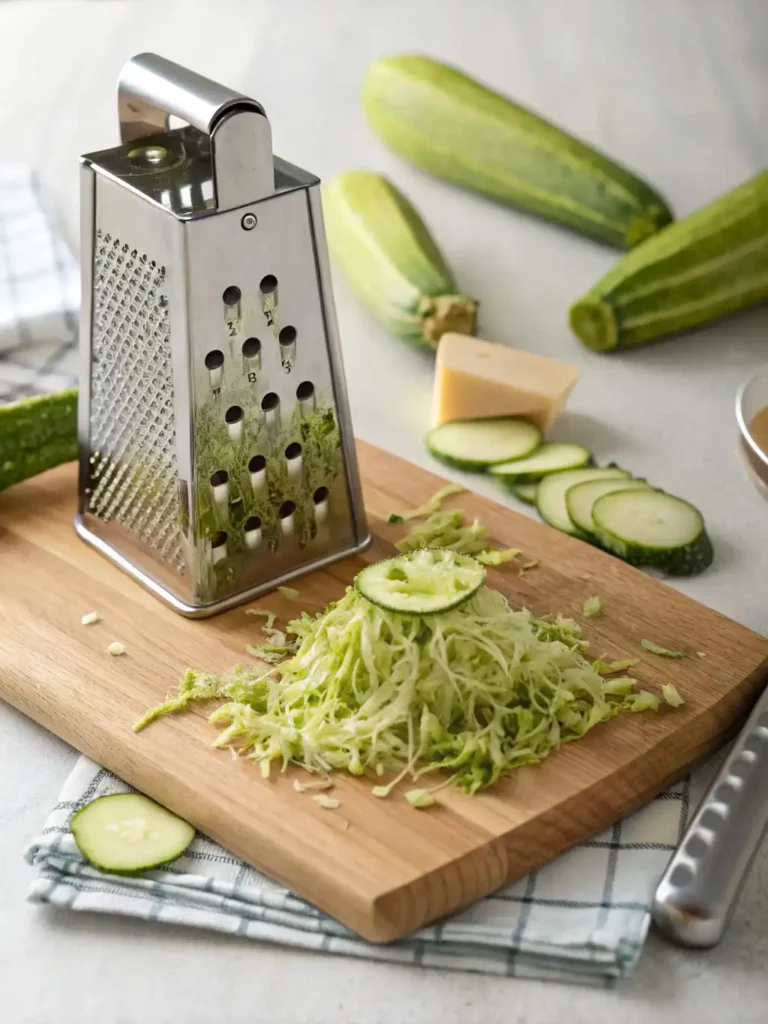 - Grate the zucchini using a coarse grater. Gently squeeze out excess moisture with a clean towel or paper towels, but keep it slightly damp for moisture in the cake.