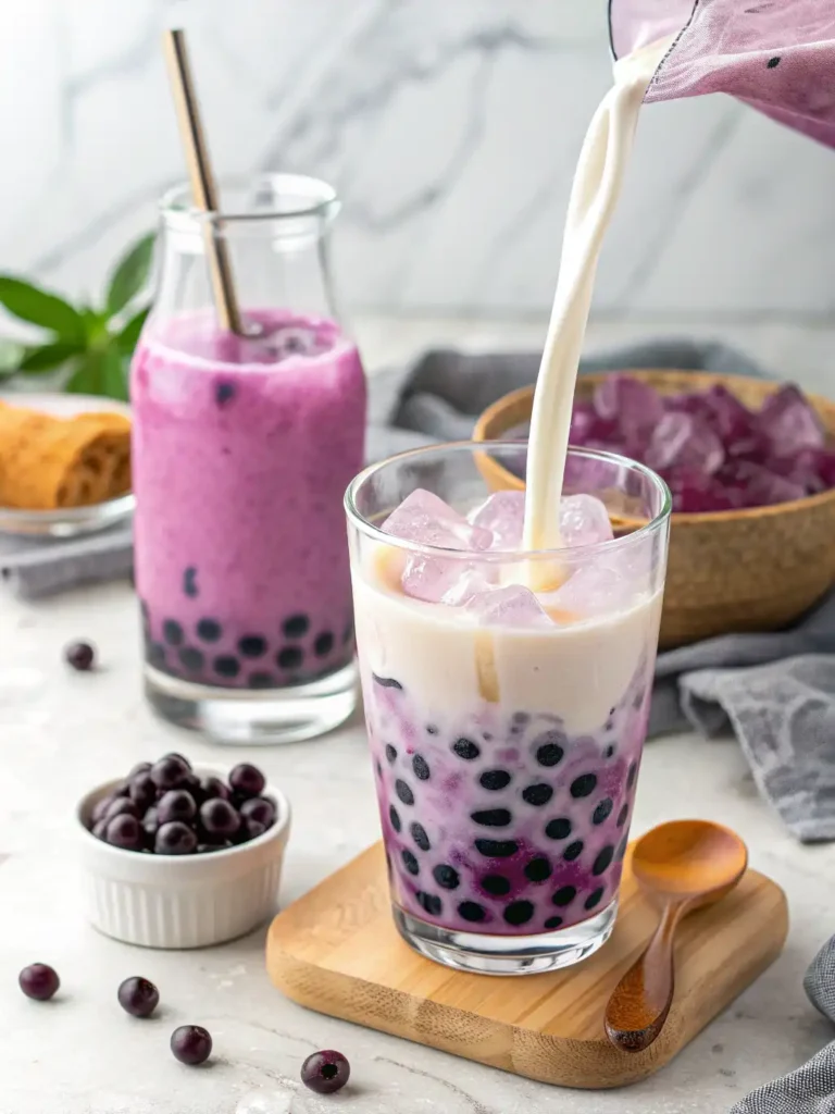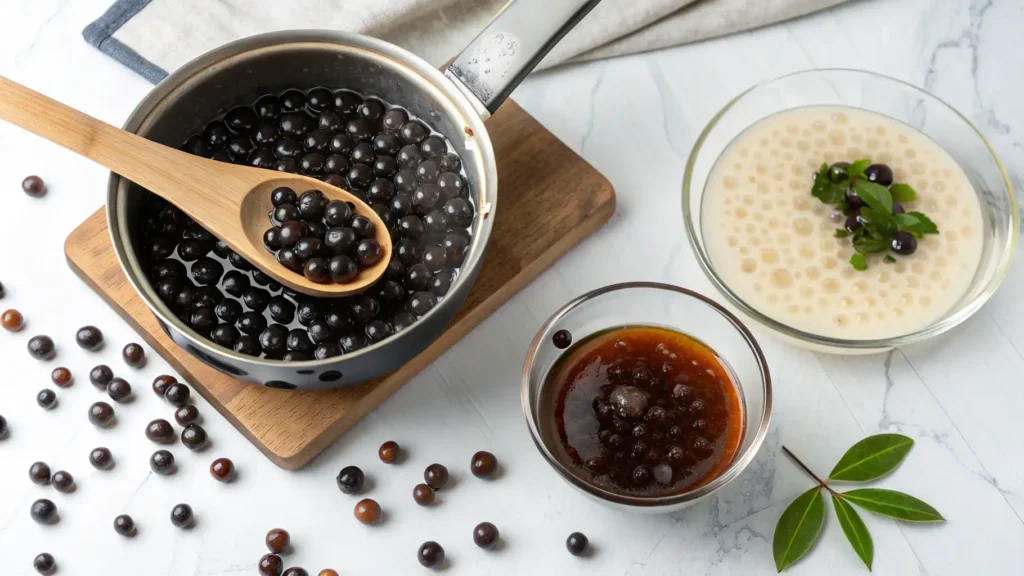 - Cook the boba: Boil tapioca pearls according to package instructions. Drain, rinse, and optionally toss with sugar.