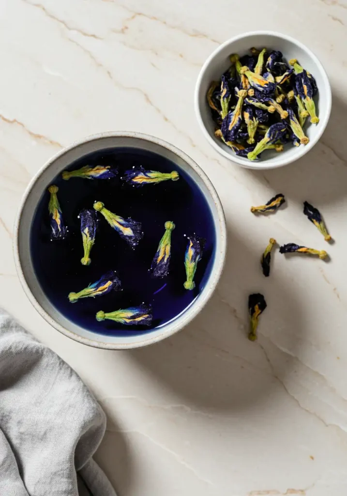 - Brew the tea: Pour hot water over butterfly pea flowers. Steep 5–10 minutes. Strain.