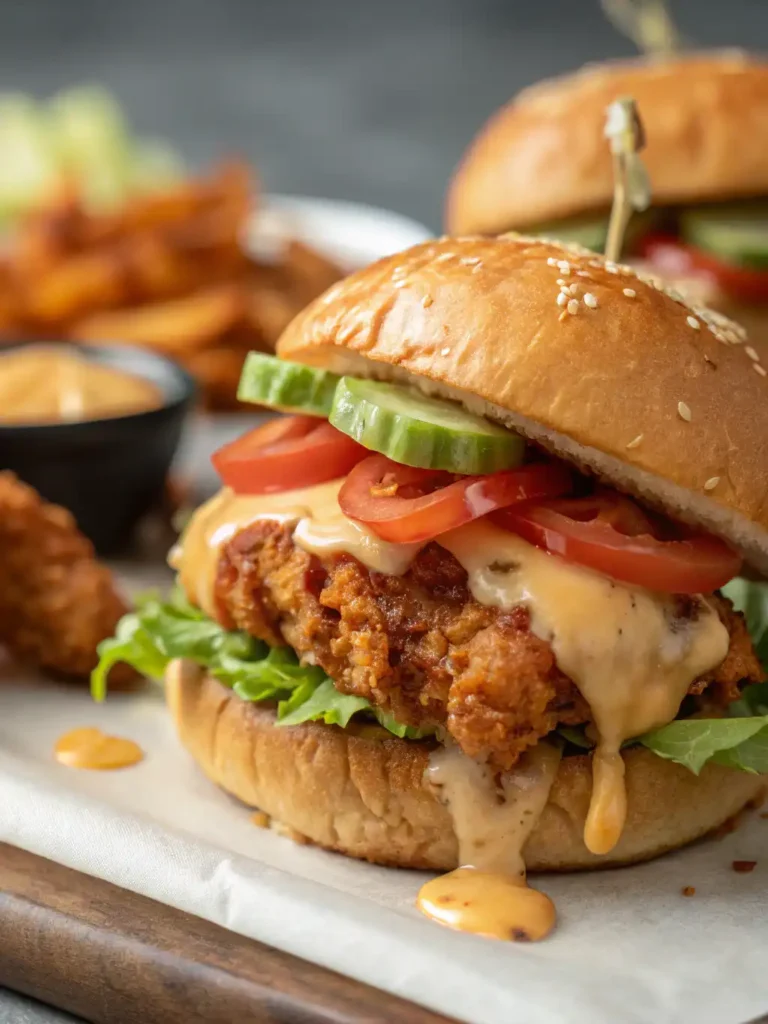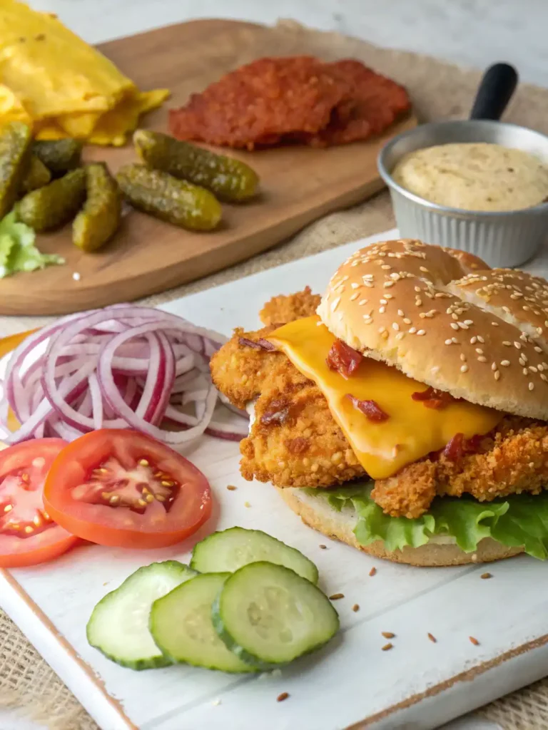 - Assemble the burgers: Spread ranch dressing or BBQ sauce on the bottom bun. Layer with lettuce, tomato, and onion. Place the cheesy chicken patty on top and cover with the top bun.