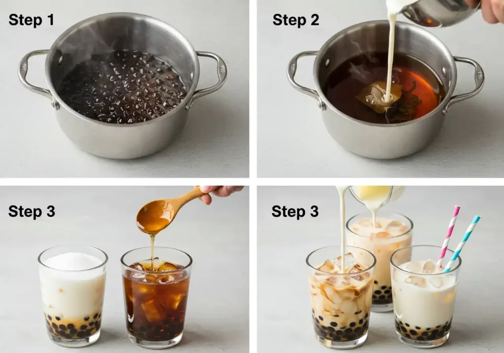 - 2 Cook the Tapioca Pearls: Boil 4 cups of water in a saucepan. Add tapioca pearls and stir to prevent sticking. Simmer for 15-20 minutes until soft and chewy. Drain and soak in brown sugar syrup.