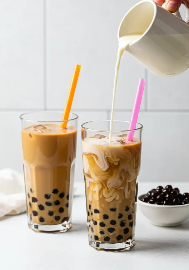 - 3 Assemble the Drink: In a glass, add 2 tbsp of tapioca pearls, ½ cup milk, and ½ cup chilled tea. Add sweetener to taste and fill with ice. Mix well.