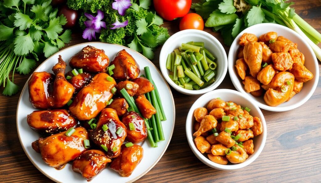 Asian-inspired chicken dishes are perfect for quick meals. They bring a variety of flavors and healthy ingredients. The honey garlic chicken is a favorite, ready in under 30 minutes.