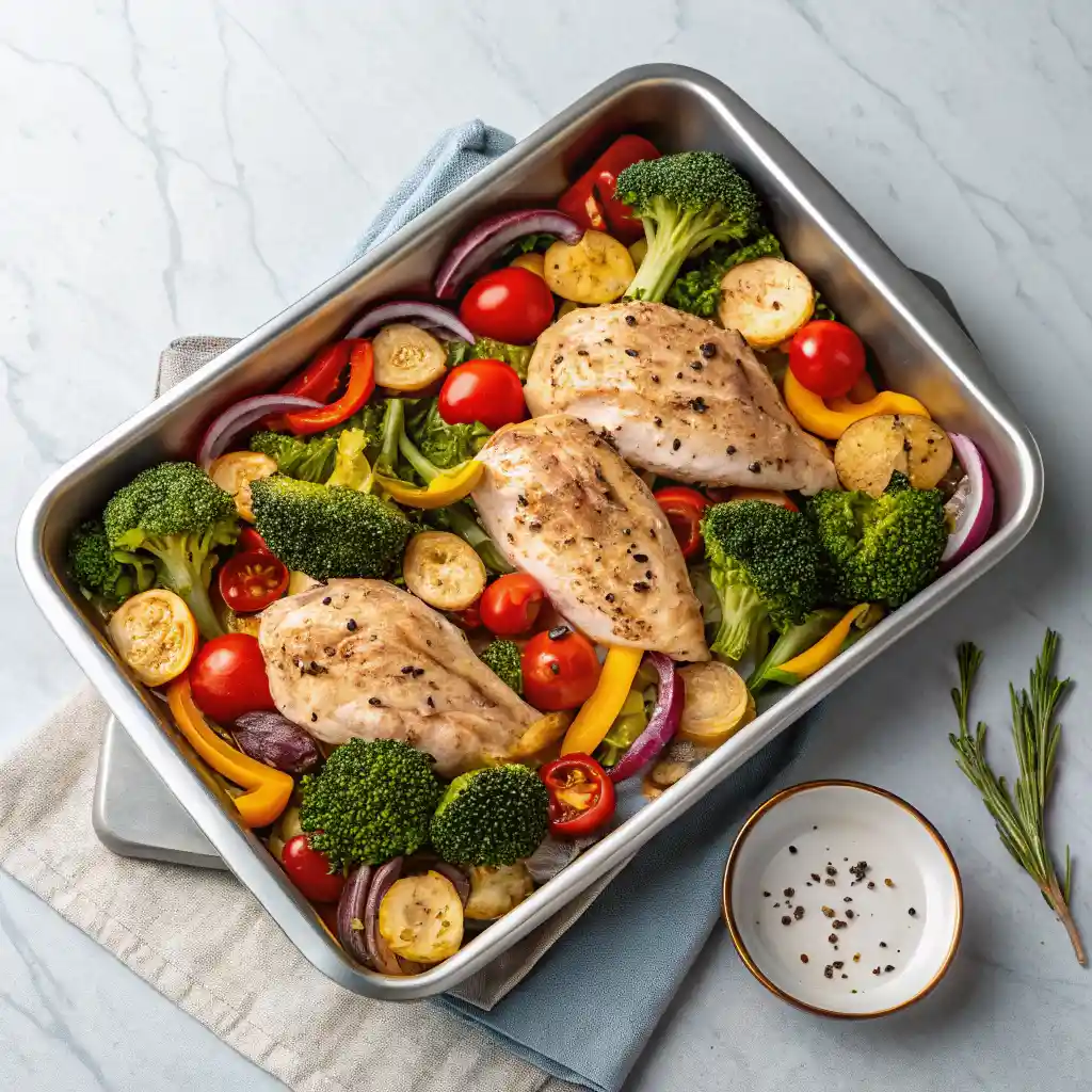 A tasty delicious poultry recipe is the Rainbow Sheet Pan Chicken and Vegetables. It features chicken thighs, sweet potatoes, broccoli, red bell peppers, zucchini, and yellow squash. These veggies are packed with fiber, vitamin C, and antioxidants. To cook, preheat your oven to 400°F. Roast the sweet potatoes for 10 minutes, then add the chicken and veggies for 15-20 minutes more.