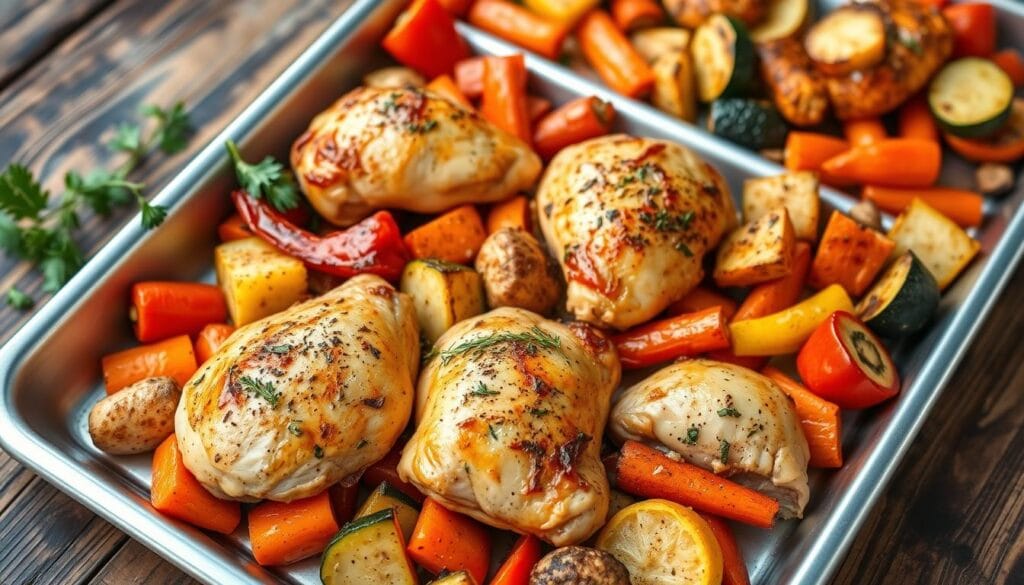 Sheet pan dinners are a fantastic choice for healthy chicken recipe ideas. They’re simple to prepare and let you pick your favorite veggies and spices. Try a mix of chicken thighs, sweet potatoes, broccoli, and red bell peppers for a tasty, nutritious meal.