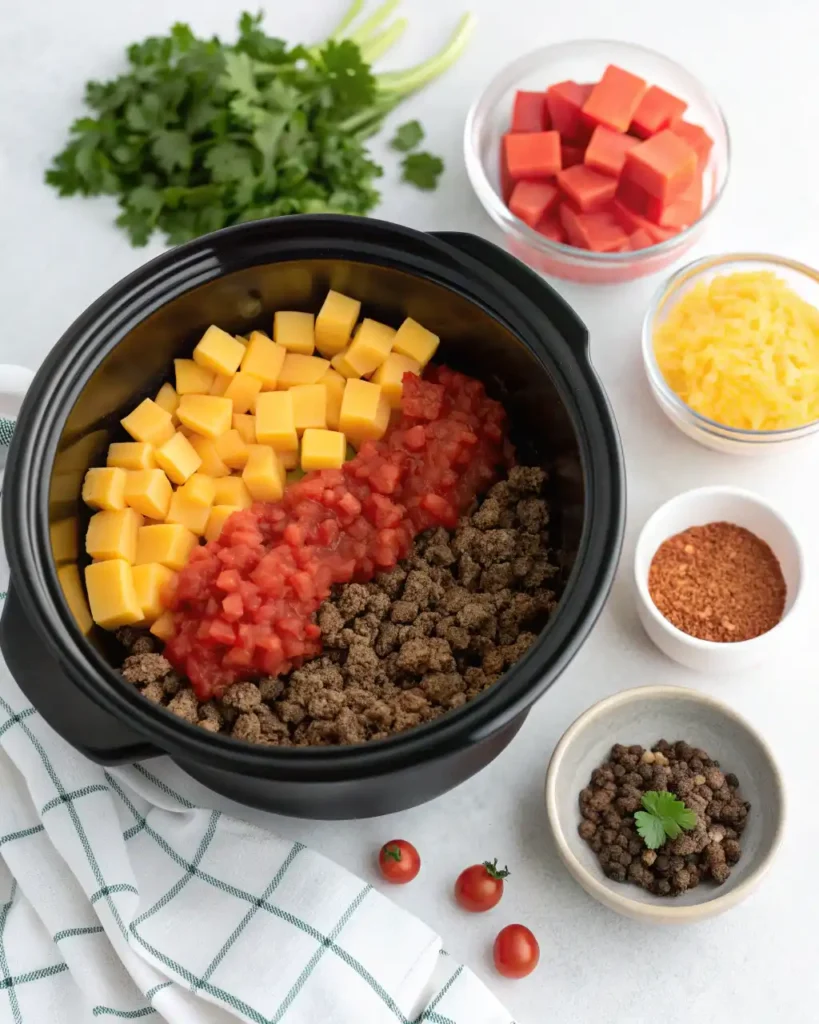 - Add the cooked beef, cubed Velveeta, cream cheese, and Rotel tomatoes to your crockpot.