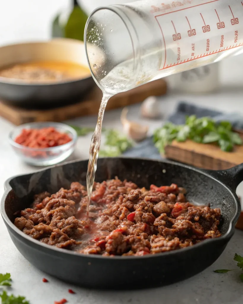 - In a skillet over medium heat, cook ground beef until fully browned. Drain excess grease.