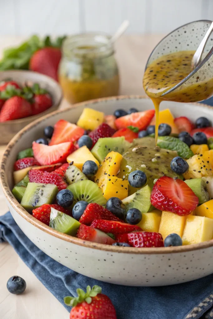 - Pour the dressing over the fruits and gently toss to coat.