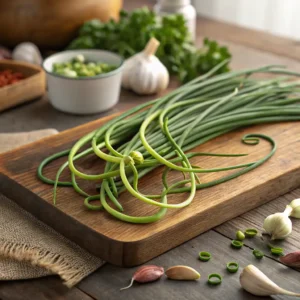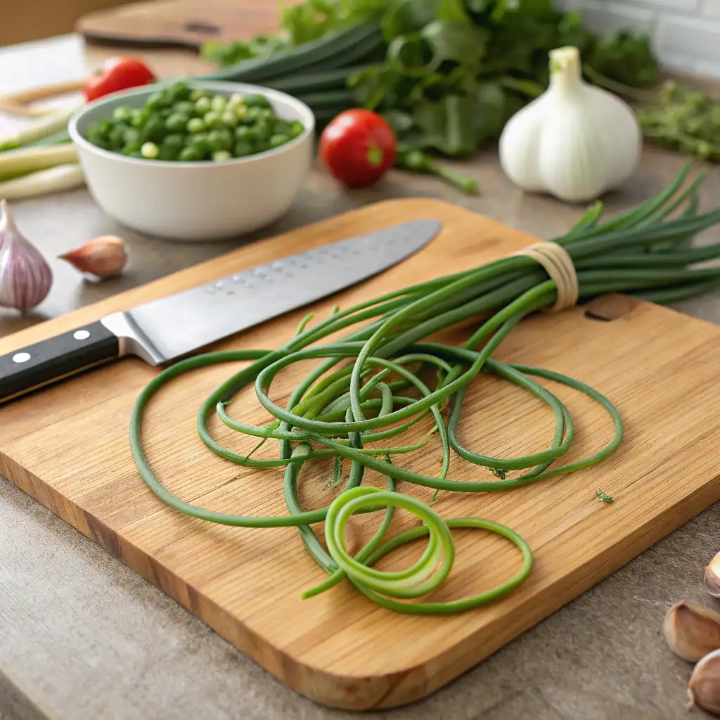Garlic scapes have a fresh, mild garlic flavor that’s less pungent than garlic cloves. They taste bright, slightly sweet, and herbal, making them perfect for adding gentle garlic notes without overpowering a dish.