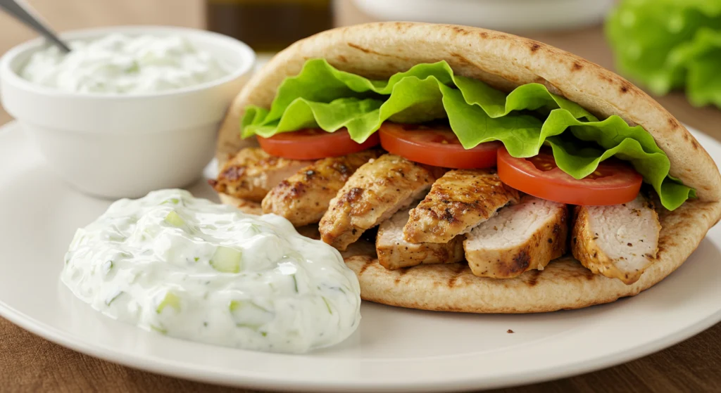 Warm the pita bread, spread tzatziki sauce on it, add the cooked chicken, and top with tomatoes, onions, and lettuce. Wrap it up, and it’s ready to serve!