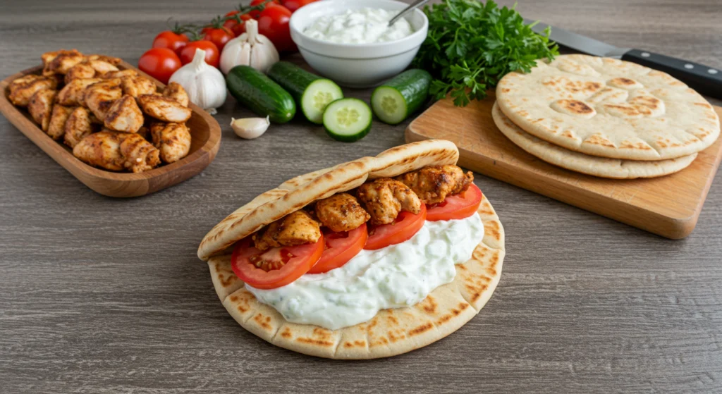You’ll need chicken, Greek yogurt, garlic, olive oil, lemon juice, pita bread, and spices like oregano, paprika, and salt. Don’t forget the tzatziki sauce ingredients: cucumber, dill, and yogurt.