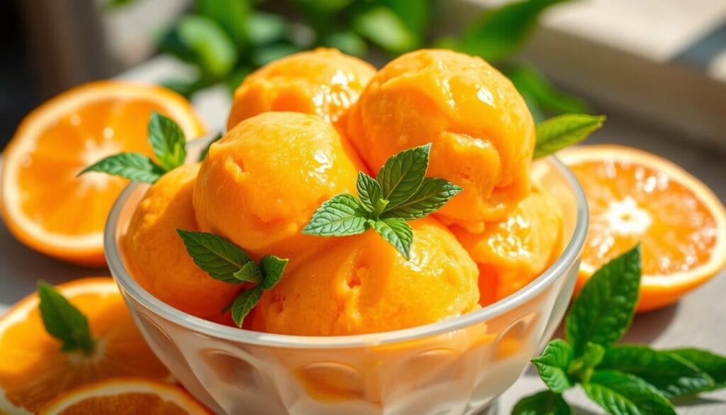 A great orange sherbet recipe starts with the right oranges. Valencia, Blood, and Cara Cara oranges are good choices. They mix sweetness and acidity well, making them perfect for dairy-free ice cream.