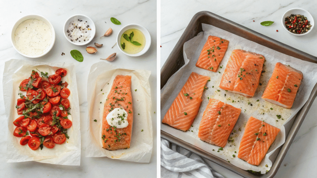 - Marinate the Salmon: Marinating the fish for 20-30 minutes in a mixture of olive oil, garlic, lemon juice, and herbs enhances the flavor and keeps the salmon moist.
