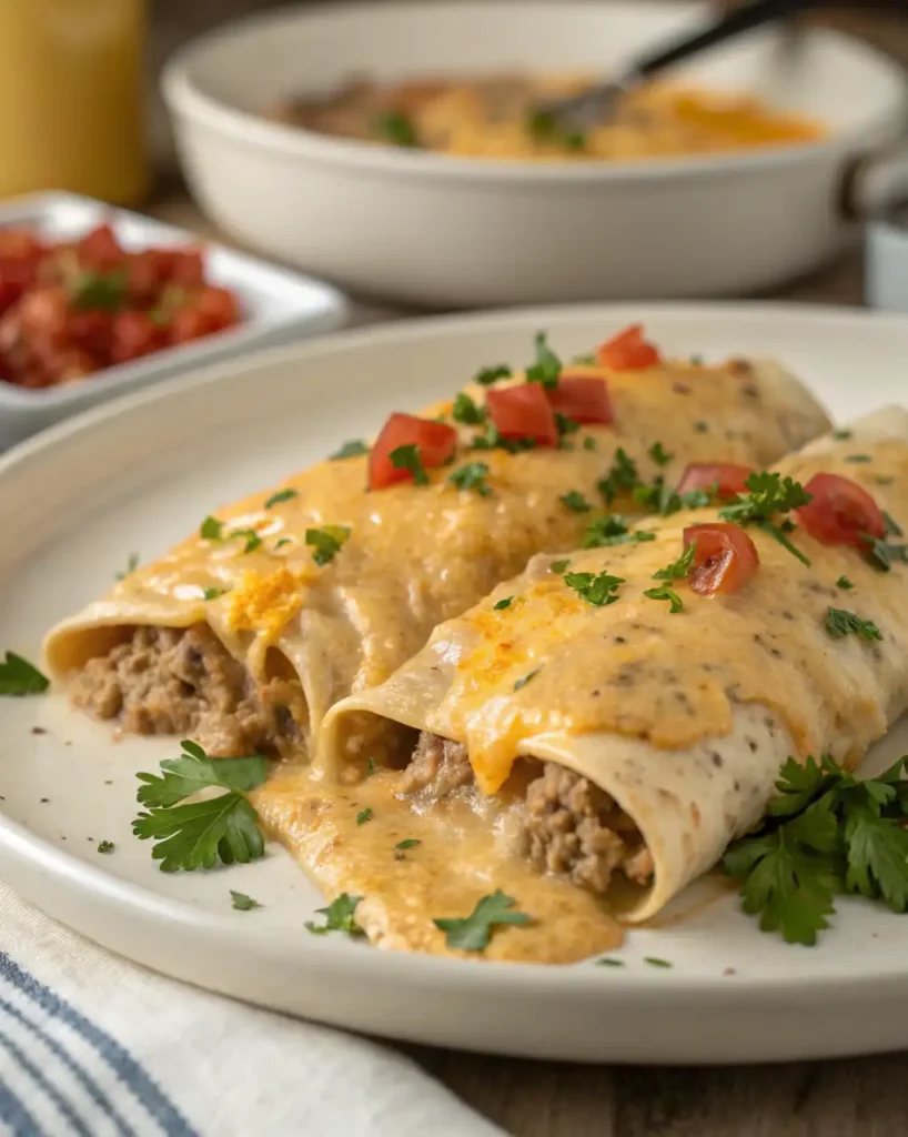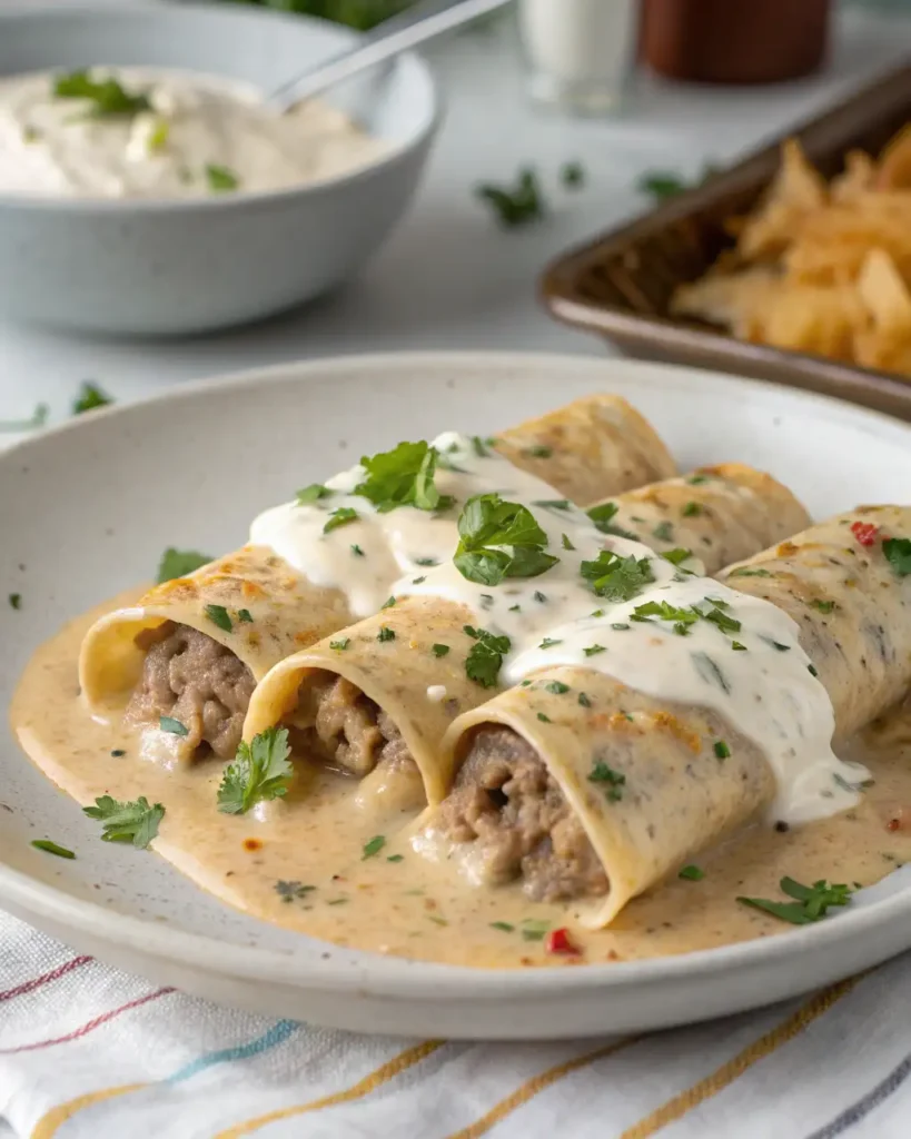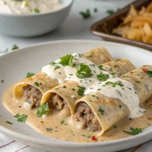 - Pour sausage gravy over the rolled enchiladas, ensuring they are well covered.