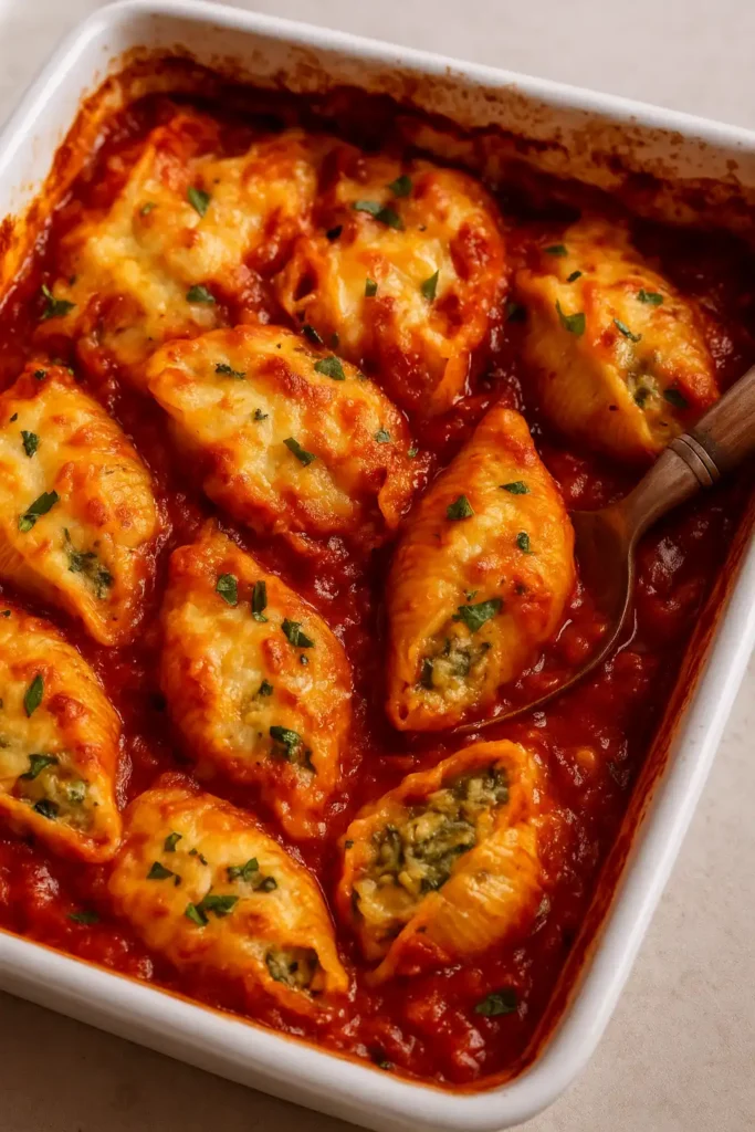 Serve the stuffed shells warm, with extra marinara sauce on the side for dipping. A simple salad or crusty bread pairs perfectly with this dish. You can also sprinkle extra grated Parmesan on top for added flavor.
