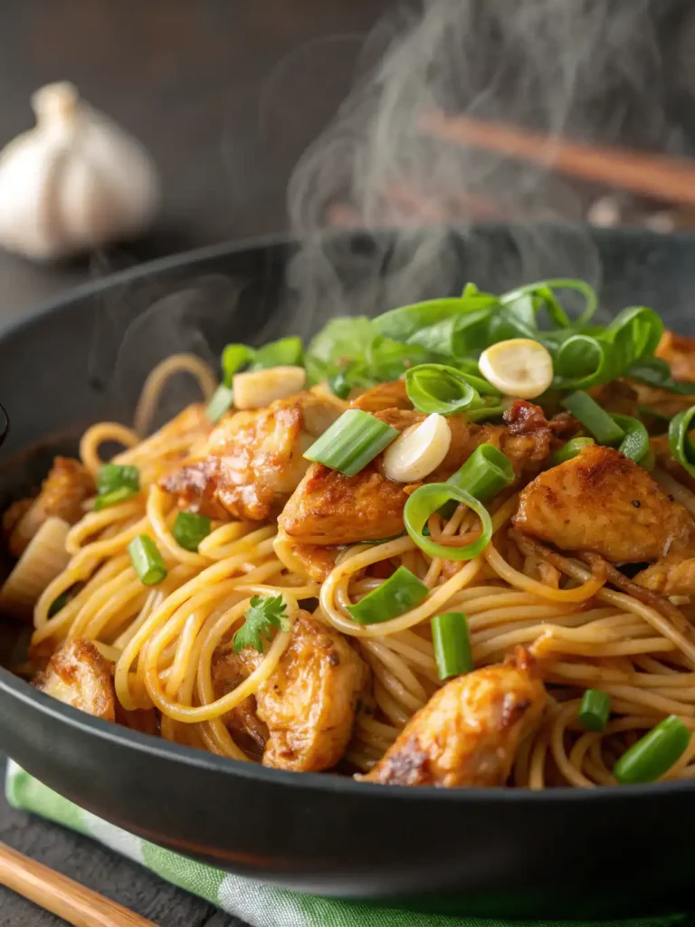 • Sprinkle chopped green onions and sesame seeds on top. Serve immediately for a hot, flavorful dish of *Sticky Garlic Chicken Noodles*.