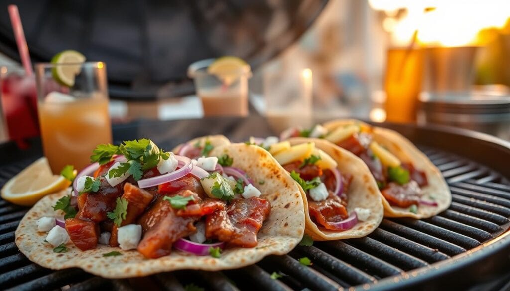 Imagine the smell of sizzling pork and spices in the air as you cook on your Weber kettle. You’re starting a journey to make authentic Mexican tacos, like taco al pastor. With a Weber kettle, you can get the same great flavors and textures as the real thing. This makes for a memorable homemade tacos experience.