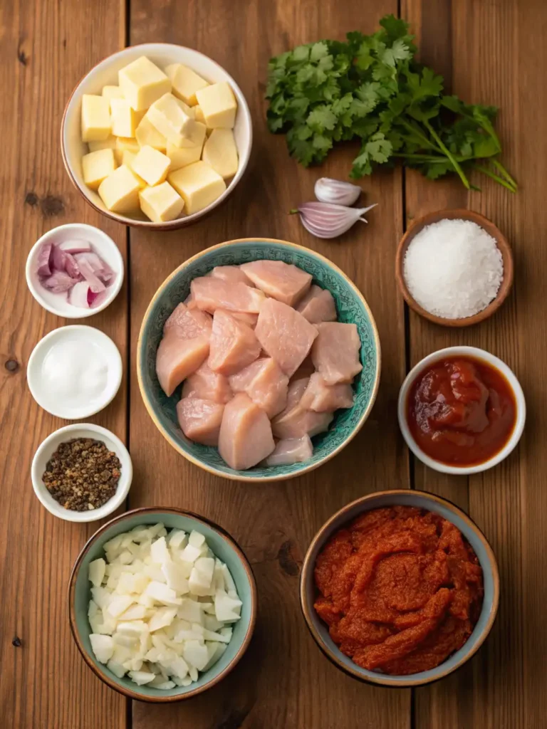 Buttered chicken typically includes chicken breast or thighs, butter, onions, garlic, tomato paste, heavy cream, chili powder, cumin, salt, pepper, and fresh herbs like cilantro. Some versions may include yogurt or lemon juice for extra flavor.