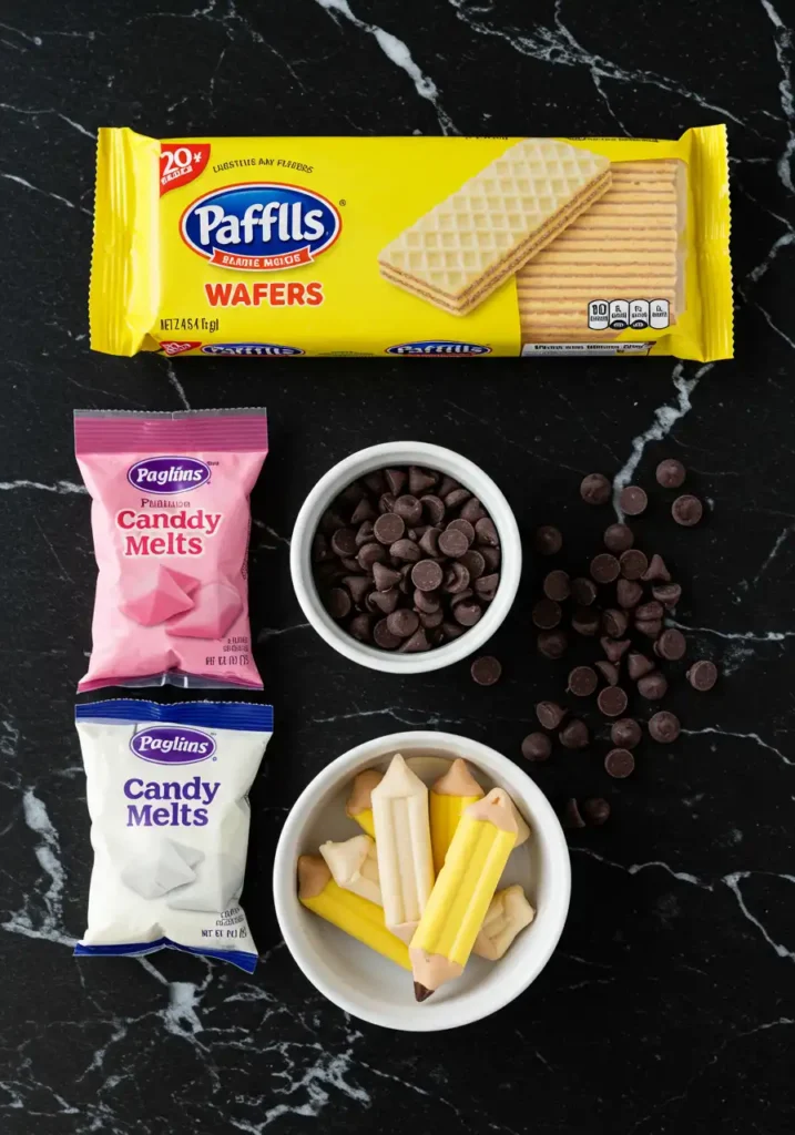 To make wafer pencils, cut one end of a wafer cookie into a point, dip it in yellow candy melts, add a mini chocolate chip at the tip, and stick a pink candy on the other end for the eraser. Let everything set—and you’re done!